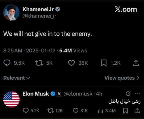 ایلان ماسک شامگاه شنبه به متنی که حساب کاربری انگلیسی علی خامنهای در شبکه اجتماعی ایکس منتشر کرده بود، پاسخ داد. حساب کاربری علی خامنهای نوشته بود: «ما تسلیم دشمن نمیشویم» و ایلان ماسک در پاسخ به آن به فارسی نوشت: «زهی خیال باطل».
