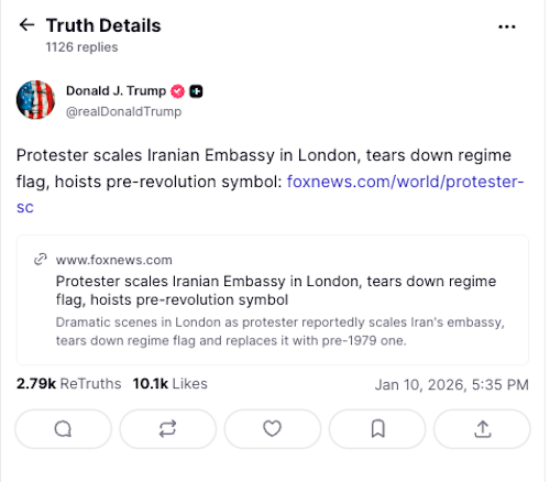 ترامپ خبر برافراشتهشدن پرچم شیروخورشید در سفارت ایران در لندن را بازنشر کرد