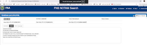 ایران با صدور اعلان نوتام (NOTAM) اعلام کرد که حریم هوایی خود را بسته است.