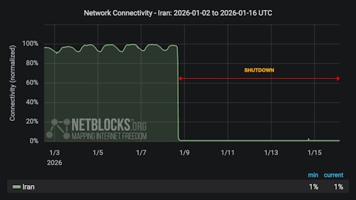 دادههای نتبلاکس و کلادفلر نشان میدهد از ظهر ۸ ژانویه ۲۰۲۶ (۱۸ دی) ترافیک اینترنت در ایران به حدود ۵ درصدِ سطح عادی سقوط کرده و این افت ناگهانی، یک «اقدام مهندسیشده و عمدی» از سوی حکومت توصیف شده است.