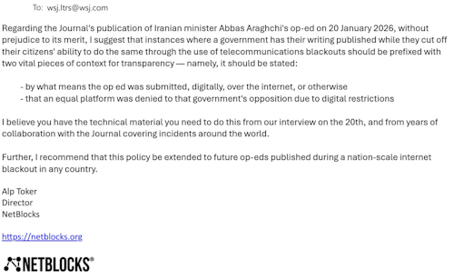 نتبلاکس، وبسایتی که دسترسی جهانی به اینترنت را رصد میکند با انتشار پستی در شبکههای اجتماعی اعلام کرد که در اعتراض به انتشار مقاله عباس عراقچی، وزیر خارجه ایران نامهای به تیم تحریریه والاستریت ژورنال نوشته و خواستار توضیح درباره نحوه ارسال مقاله از سوی این مقام ایرانی شده است.