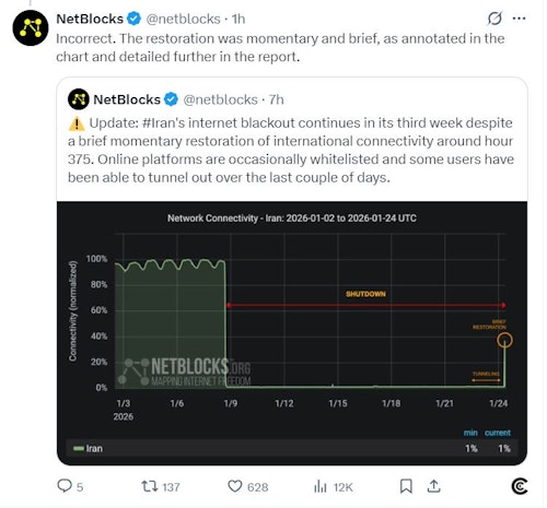 گروه نتبلاکس که دسترسی به اینترنت در سطح جهان را رصد میکند در شبکه اجتماعی ایکس ادعاها مبنی بر «بازگشت ۴۰ درصدی» اینترنت را رد کرد.