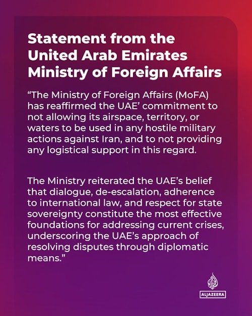 امارات متحده عربی بار دیگر بر تعهد خود تأکید کرد که اجازه نخواهد داد از حریم هوایی، قلمرو زمینی یا آبهای این کشور برای هیچگونه اقدام نظامی علیه ایران استفاده شود.