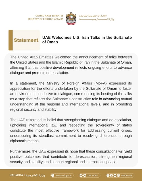 وزارت امور خارجه امارات متحده عربی با انتشار بیانیهای رسمی، از برگزاری گفتگوها میان جمهوری اسلامی ایران و ایالات متحده در مسقط استقبال کرد و آن را تحولی مثبت در جهت پیشبرد گفتگو و کاهش تنشها دانست.