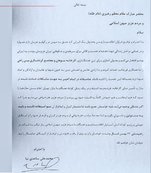 محمدعلی ساعدینیا، مالک مجتمع معروف گردشگری و کارخانه «سوهان محمد» در قم، با انتشار نامهای سرگشاده خطاب به علی خامنهای، رهبر جمهوری اسلامی، بابت تعطیلی مغازههایش در جریان اعتصابات سراسری عذرخواهی کرد.
