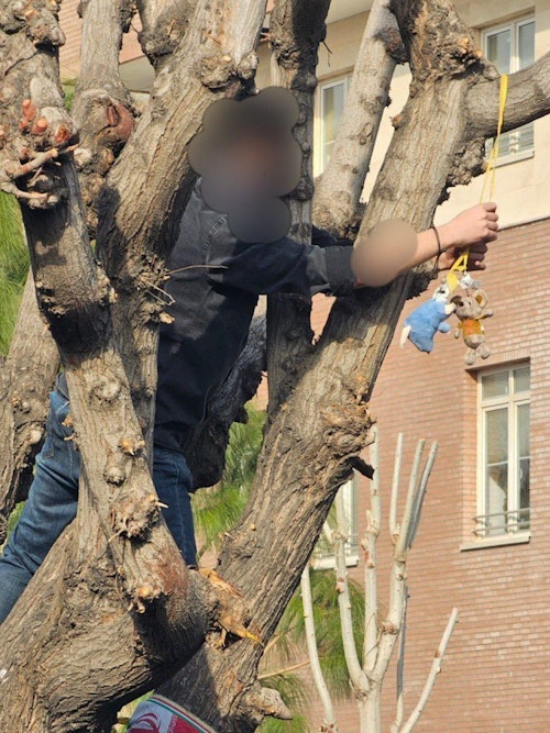 در این تصاویر عروسکهایی به شکل موش دیده میشوند که از درختی به دار آویخته شدهاند. این در حالی است که شماری از اعضای بسیج با دانشجویان معترض درگیر شده و تلاش دارند عروسکها را از درخت پایین بیاورند.