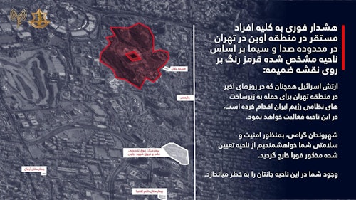 ارتش اسرائیل در پستی اعلام کرد: «هشدار فوری به کلیه افراد مستقر در منطقه اوین در تهران در محدوده صدا و سیما، بر اساس ناحیه مشخص شده قرمز رنگ بر روی نقشه ضمیمه.»