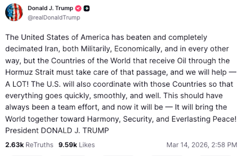 دونالد ترامپ، رئیسجمهوری آمریکا روز جمعه در شبکه اجتماعی «تروتسوشال» نوشت: «آمریکا ایران را از نظر نظامی، اقتصادی و از هر جهت دیگر شکست داده و بهطور کامل در هم کوبیده است. اما کشورهایی که از طریق تنگه هرمز نفت دریافت میکنند، باید از این گذرگاه مراقبت کنند و ما هم خیلی زیاد کمک خواهیم کرد.»
