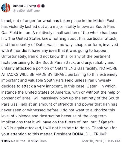 آقای ترامپ در شبکه اجتماعی «تروتسوشال» نوشت: «اسرائیل، از روی خشم نسبت به آن چه در خاورمیانه رخ داده است، با خشونت به یک تاسیسات بزرگ شناختهشدهای به نام میدان گازی پارس جنوبی در ایران حمله کرده است. بخش نسبتا کوچکی از کل این مجموعه هدف قرار گرفته است. ایالات متحده هیچ اطلاعی از این حمله خاص نداشت و کشور قطر نیز به هیچ وجه و به هیچ شکلی در آن دخیل نبود و هیچ تصوری هم نداشت که قرار است چنین اتفاقی رخ دهد.»