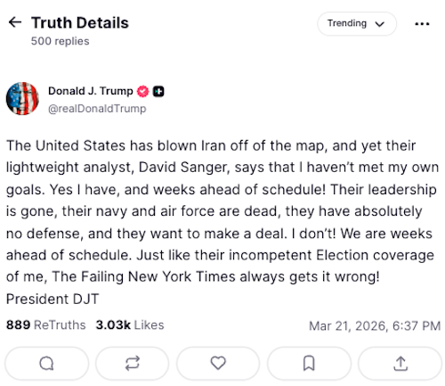 او پیشتر با انتشار فرستهای در شبکه احتماعی تروثسوشال خود نوشته بود که: «ما به اهداف خود بسیار نزدیک شدهایم و در حال بررسی کاهش تلاشهای عظیم نظامی خود در خاورمیانه در ارتباط با رژیم تروریستی ایران هستیم.»