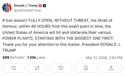 دونالد ترامپ، رئیسجمهوری آمریکا شامگاه شنبه در شبکه اجتماعی «تروتسوشال» نوشت: «اگر ایران ظرف ۴۸ ساعت از همین لحظه تنگه هرمز را بهطور کامل و بدون تهدید باز نکند، آمریکا نیروگاههای مختلف آن را هدف قرار میدهد و نابود میکند. از بزرگترین آنها هم شروع میکنیم.»