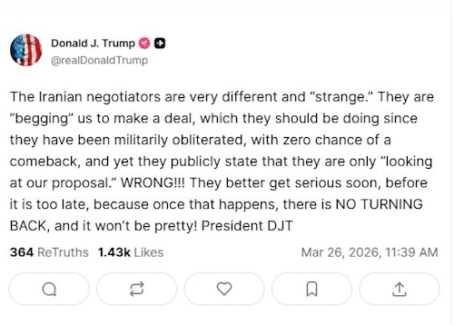 رئیس جمهور آمریکا نوشت: «مذاکرهکنندگان ایرانی بسیار متفاوت و "عجیب" هستند. آنها به ما "التماس" میکنند که توافق کنیم؛ کاری که باید انجام دهند، زیرا از نظر نظامی نابود شدهاند و هیچ شانسی برای بازگشت ندارند. با این حال علنا اعلام میکنند که فقط "در حال بررسی پیشنهاد ما" هستند.»
