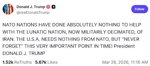 ترامپ در ساعات اولیه بامداد پنجشنبه به وقت واشنگتن در حساب کاربری خود در تروث سوشیال با حروف بزرگ نوشت: «آمریکا نیازی به ناتو ندارد، اما هرگز فراموش نکنید که این نکته در این مقطع زمانی بسیار مهم است!»