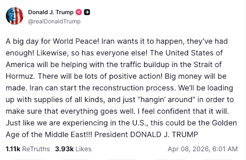 آقای ترامپ با ابراز خرسندی نوشت: این یک «روز بزرگ برای صلح جهانی» است؛ «ایران میخواهد این اتفاق بیفتد، آنها به اندازه کافی تجربه کردهاند! همچنین سایرین نیز همینطور!»